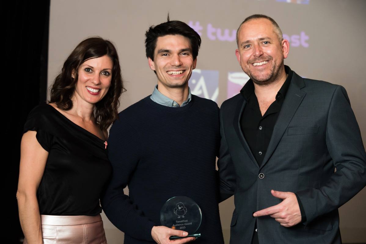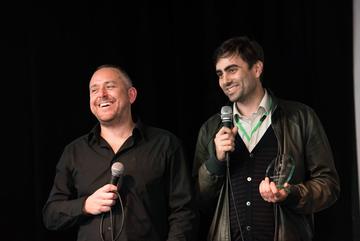 TweetFest 2015- The glorious animation Sea Child. Here is producer Jacob Thomas (below left) accepting the prize with host James Rumsey. Congratulations! Well done to the director Minha Kim, and her incredible team.