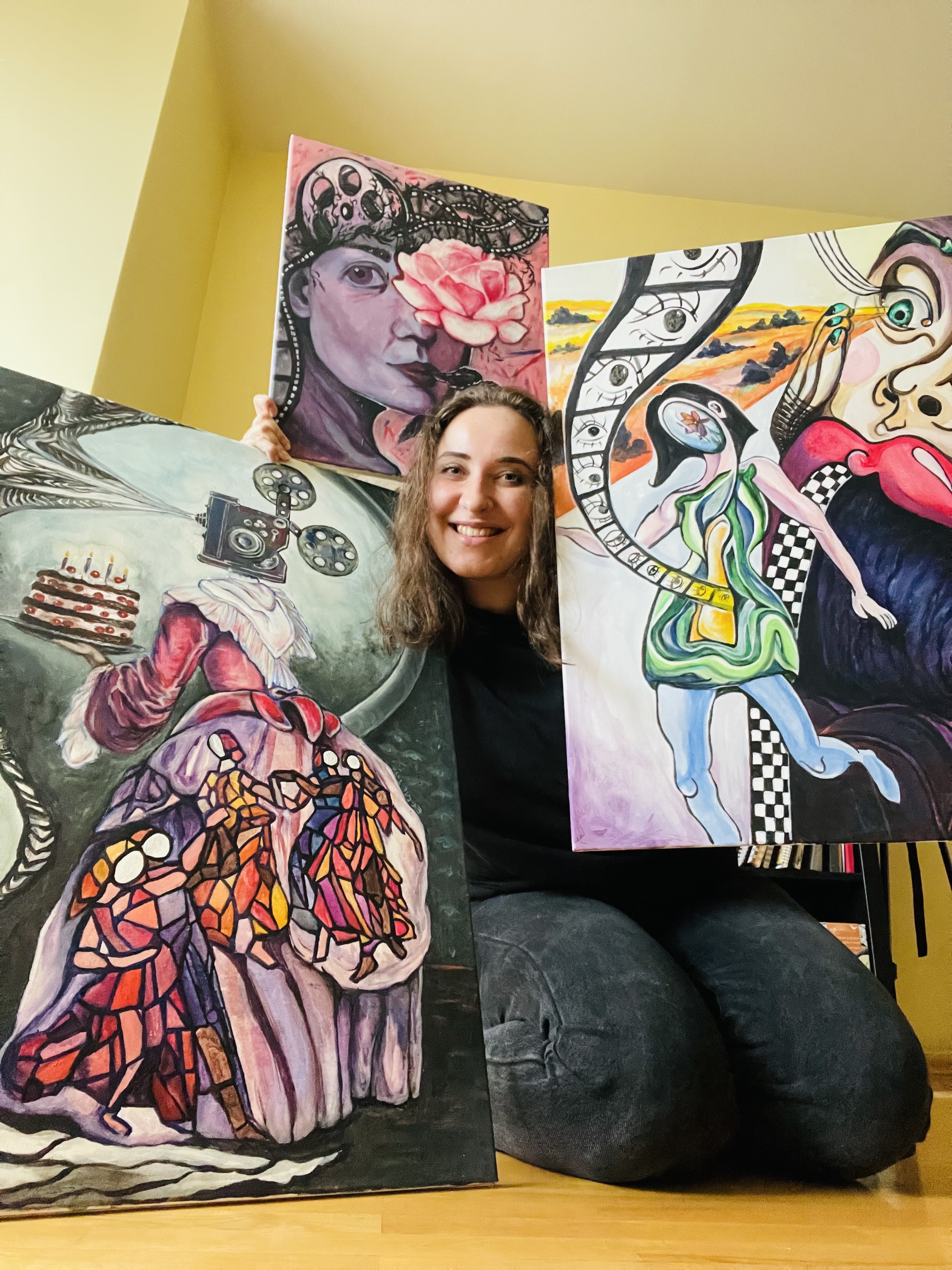 A key detail in the piece is the roll of film coming through a keyhole-shaped hole with eyes in each square interacting with the world around her. It acts as a reminder that we are all witnesses to our own becoming, constantly viewing life through the lens of memory, imagination, and choice, but sometimes such reflection is hidden deep inside us. I also wanted to capture that feeling of cinematic nostalgia with ultra-modern, pop-surrealist energy in the sense that we are both the actor and the audience of our own story.